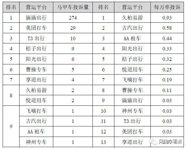“马甲车”投诉情况。“马甲车”投诉345件,占投诉总量的14.23%,环比下降61.50%,每万单投诉为0.03件。投诉主要反映实际用车与平台预约车辆信息不符、平台录用无资质车辆或司机营运。