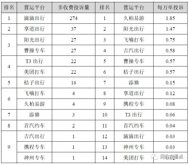 “多收费”投诉情况。“多收费”投诉441件,占投诉总量的18.19%,环比下降61.32%,每万单投诉为0.04件。投诉主要反映网约车加价议价、绕道行驶、重复收费以及春节期间加收服务费等。