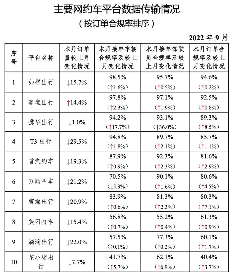 本月订单合规率增长前3名的依次是携华出行、曹操出行、万顺叫车;增长最后3名的依次是美团打车(0.9%)、享道出行(0.8%)、如祺出行(0.2%)。