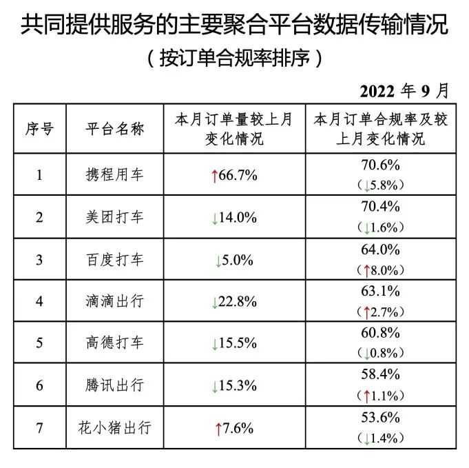 按订单合规率由高到低的分别是携程用车、美团打车、百度打车、滴滴出行、高德打车、腾讯出行、花小猪出行。