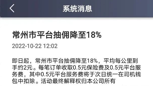 近日有江苏常州的司机爆料称,自己在跑的xx平台最近给平台司机的播报中显示,从10月22日起在常州市的平台抽佣降至18%,平台每公里到手约2元。