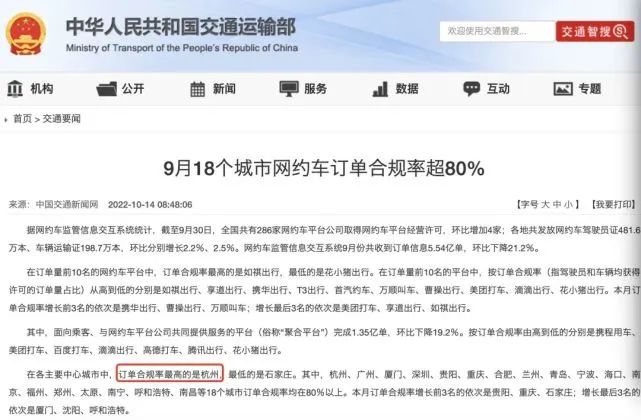 近日,交通运输部最新发布9月份网约车行业运行基本情况,杭州市网约车合规率在各主要中心城市中排名首位,已连续两个月、年度第五次居全国城市榜首。