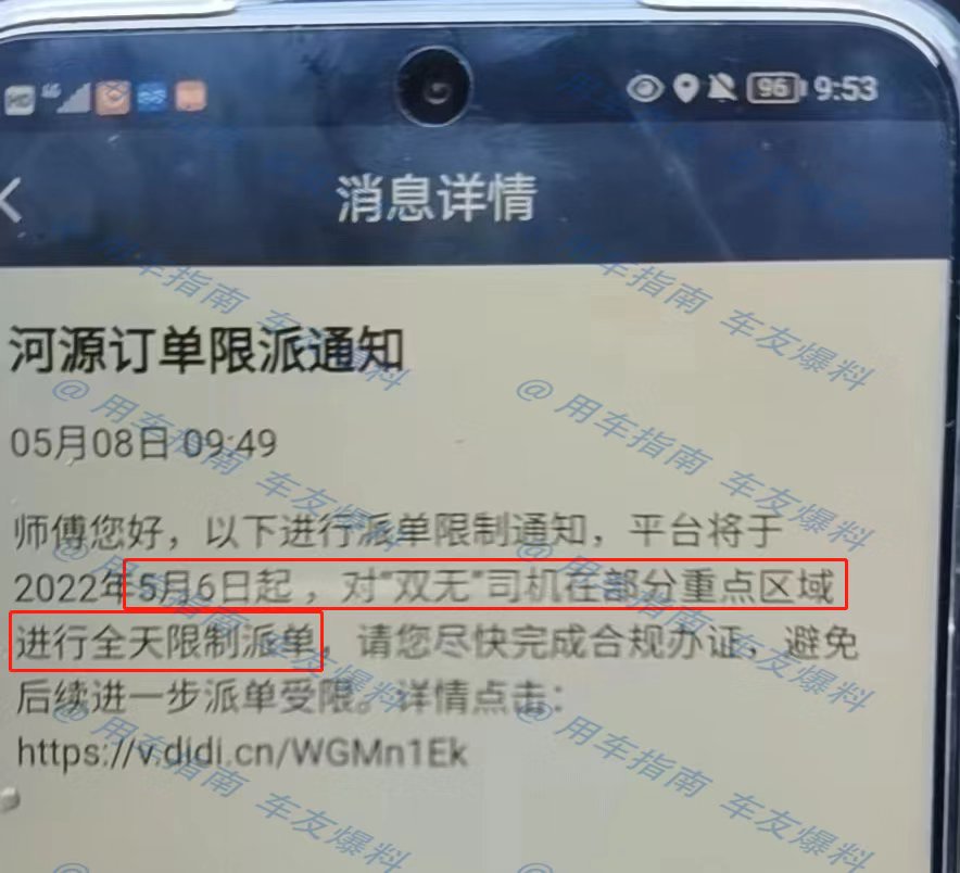 进入5月以来,不少无证司机都收到了平台发来的消息。比如广东河源,从5月6日开始,无证司机在部分重点区域进行全天限制派单。当地司机表示,地方小,接单被限制后,基本就没单可接了。