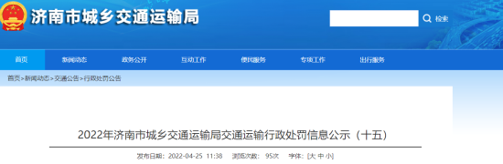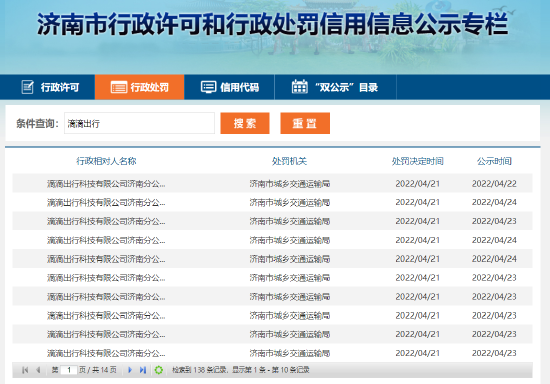 日前,山东省济南市城乡交通运输局网站公示的“2022年济南市城乡交通运输局交通运输行政处罚信息”显示,滴滴出行科技有限公司济南分公司多次因提供服务车辆未取得《网络预约出租汽车运输证》被罚款。据统计,仅4月份滴滴出行科技有限公司济南分公司就被处罚74次,每次处罚金额2万元,总计148万元。