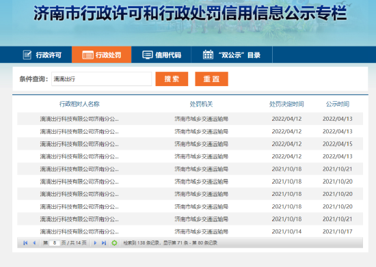 据公示显示,滴滴出行科技有限公司济南分公司提供服务车辆未取得《网络预约出租汽车运输证》,被济南市城乡交通运输局依据《网络预约出租汽车经营服务管理暂行办法》第三十五条第(一)项进行了罚款。另据统计,自2021年10月份以来,滴滴出行科技有限公司济南分公司已经因同样原因被处罚138次。
