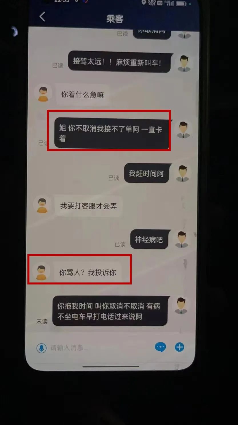 因为乘客一直拖着不肯取消订单,一直卡着司机,终于惹怒司机,忍不住骂了一嘴。这下倒好,乘客倒打一耙,说投诉司机了。