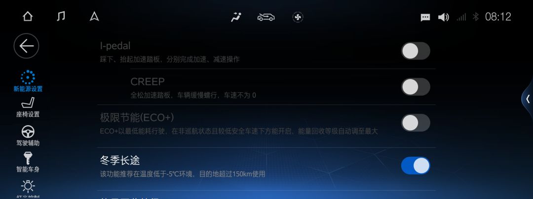 (2)使用冬季模式(ECO+模式):长按I-PEDAL按键或在显示屏菜单中打开设置均可开启ECO+模式,即为冬季模式,冬季模式(ECO+模式)适用于新能源车冬季行驶。