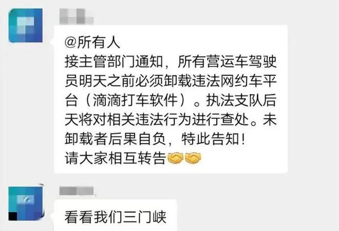 根据网上流传的消息显示,在一则疑似当地网约车车主微信群消息显示,有车主称,“接主管部门通知,所有运营车驾驶员明天之前必须卸载违法网约车平台(滴滴打车软件),执法支队后天将对相关违法行为进行查处,未卸载者后果自负。” 随后,该车主又发布消息称“看看我们三门峡。” 8月10日,记者从三门峡市交通运输局道路运输服务中心相关工作人员处获悉,网上流传图片并非完全属实,三门峡市交通运输局只是针对没有相关运营资质的平台及司机个人进行下达通知,以“滴滴”为例,“滴滴”目前并未在三门峡市按照要求进行备案,“这就意味着存在极大的风险。” 因此,三门峡交通运输局已多次约谈“滴滴”公司尽快补全手续,并在三门峡市按照要求设立分公司,尽快进行整改。 工作人员表示,目前滴滴在全省主要以设置办事处的形式进行运营,三门峡市考虑到如果滴滴在此地设置分公司,不仅有助于平台更易管理,而且将会带动当地就业发展。因此三门峡市交通运输管理局正在就此事进行研究,是否同意滴滴以办事处的形式在三门峡市进行运营。